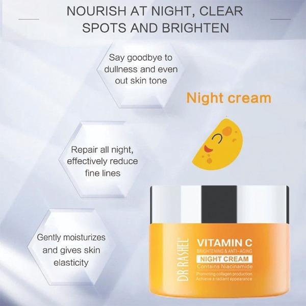 Vitamin C Day Cream for skin rejuvenation. Infused with Vitamin C for brightening and evening skin tone. Provides deep hydration and nourishment for overnight repair.